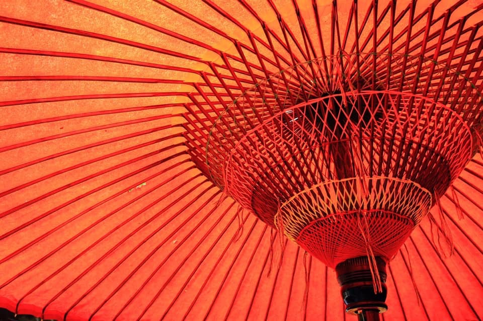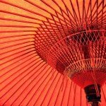 和傘の紅色が太陽光に照らされ輝く風情が、一瞬の揺らぎの中で切り取られていました。