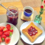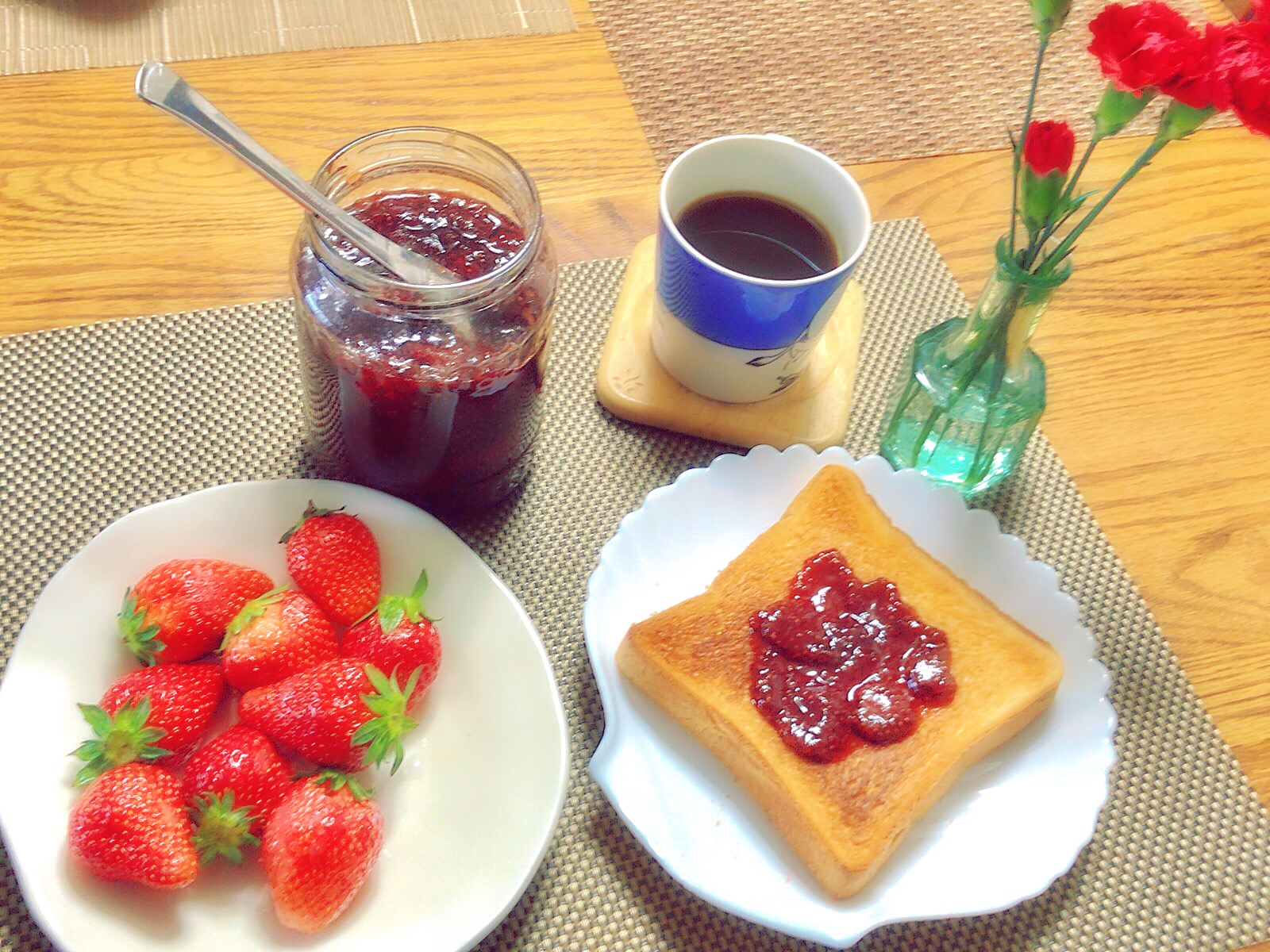 普段は禁じられているバターをトーストにうす~く塗り広げる。それだけでも、もうたまらん僕なのだが、瓶からごろごろの苺ジャムを取り出し、トーストの上に。。。。